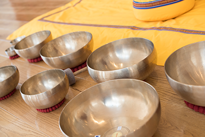 Schluss-Entspannung der Yogastunden wird durch Klangschalen-Klänge
